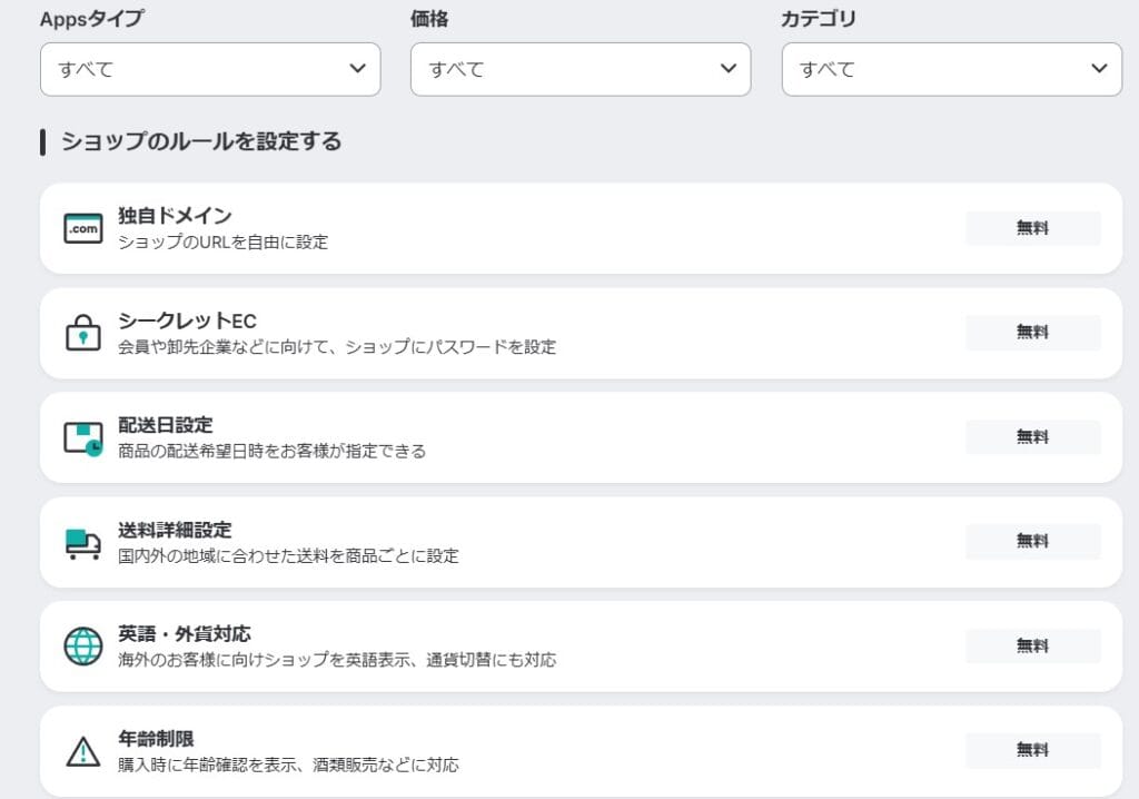 「予約販売」「定期購入」「クーポン」など、拡張アプリを追加すれば機能もどんどん増やせます。