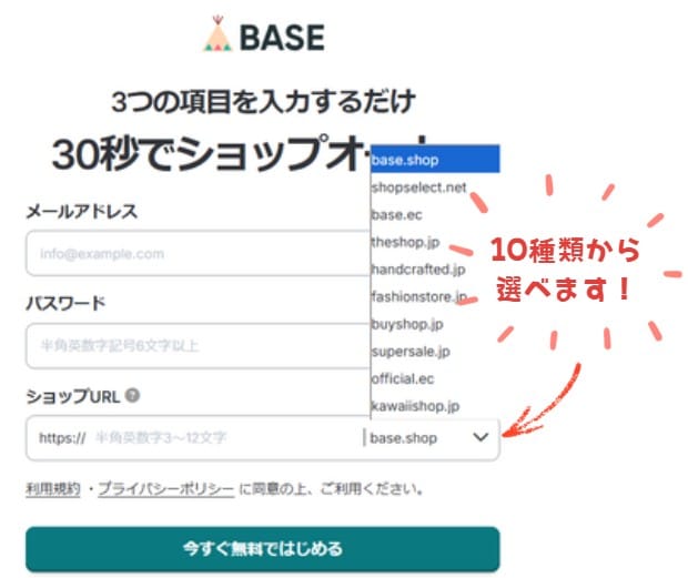 ショップURLは、末尾のドメインも10種類から選ぶことができますよ!