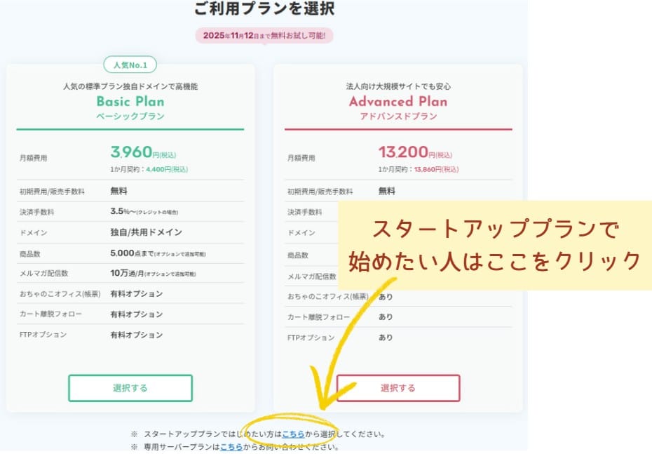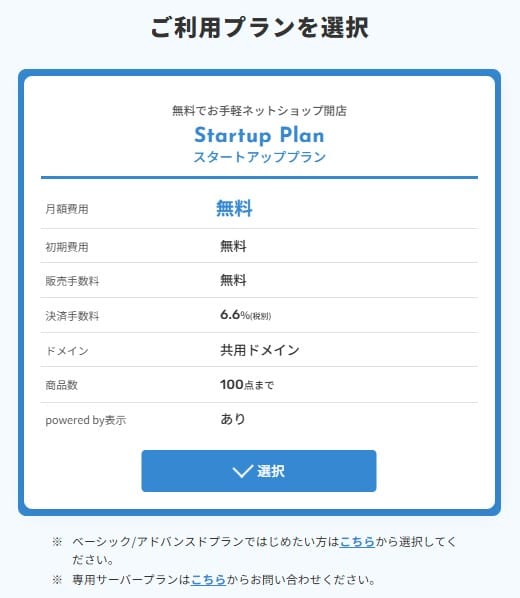 有料プランの案内しかなくて慌てるかもしれませんが、有料プラン案内の下部に小さく「スタートアッププランではじめたい方はこちら」というリンクがあるので、そこをクリックします。