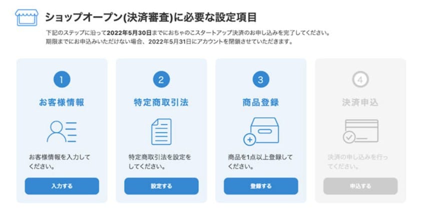 おちゃのこネットのスタートアッププランは、「おちゃのこスタートアップ決済」の審査に合格しないとショップを本OPENできません。